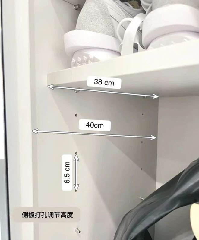 同时,做鞋柜的时候,更建议大家在内部打排孔,做成隔板可调的设计,否则又会出现隔板之间空间浪费,又或者隔板间距太窄,鞋子放不进去等情况。